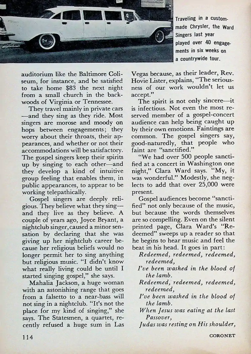Neben der schlichten Spiritualität Jacksons zeigte das Magazin auch den glamouröseren Teil der Szene, wie etwa das maßgeschneiderte Chrysler-Automobil der Clara Ward Singers.