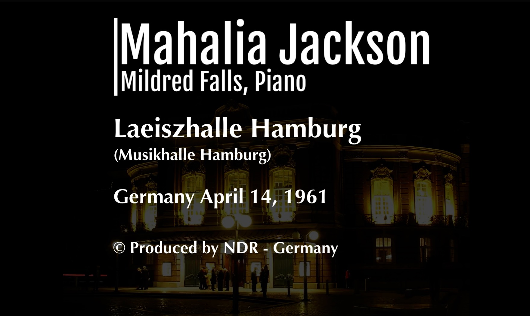Dieses besondere Konzert innerhalb ihrer Europatournee im Jahe 1961, kann ich Ihnen erstmals in voller Länge präsentieren. Bisher waren nur einzelen Stücke bzw. eine ca. 40 minütige Fassung veröffentlicht worden. Vor allem bei der Audioqualität war ich bemüht, diese so weit es geht zu verbessern, ohne jedoch den authentischen Charakter zu verfälschen.