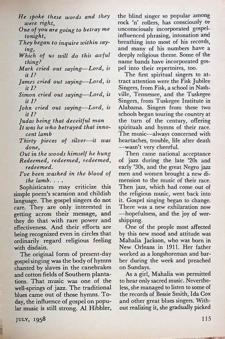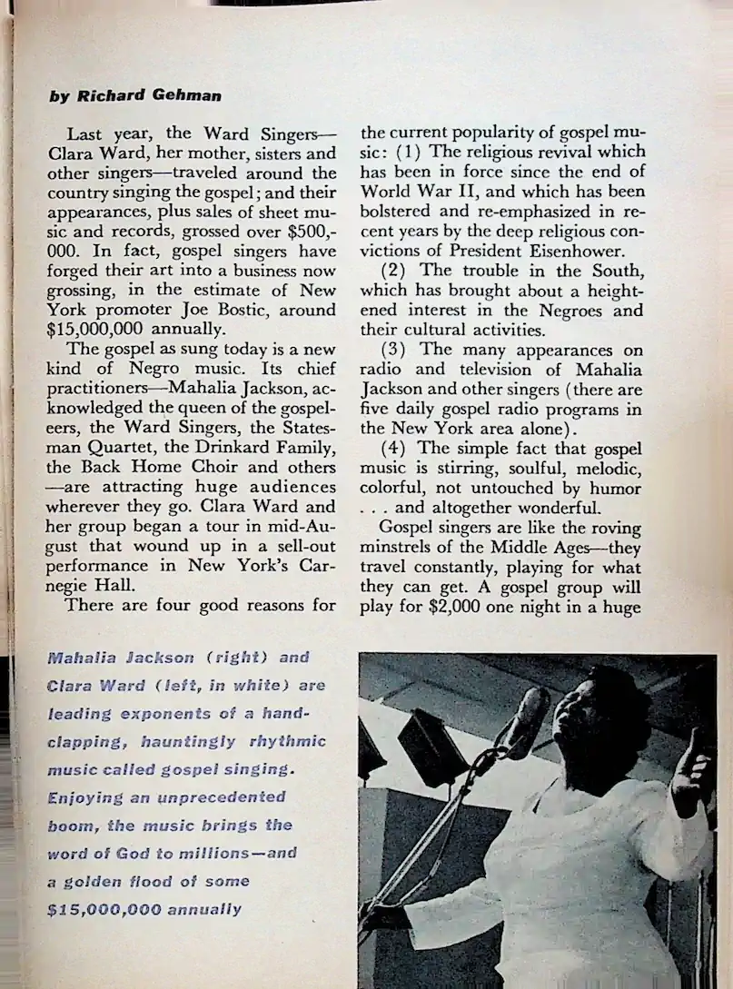Ein Stück Zeitgeschichte: Dieser Artikel aus dem Jahr 1958 ist heute ein wertvolles Dokument dafür, wie Gospelmusik den Mainstream eroberte und Mahalia Jackson zur „Queen of Gospel“ krönte.