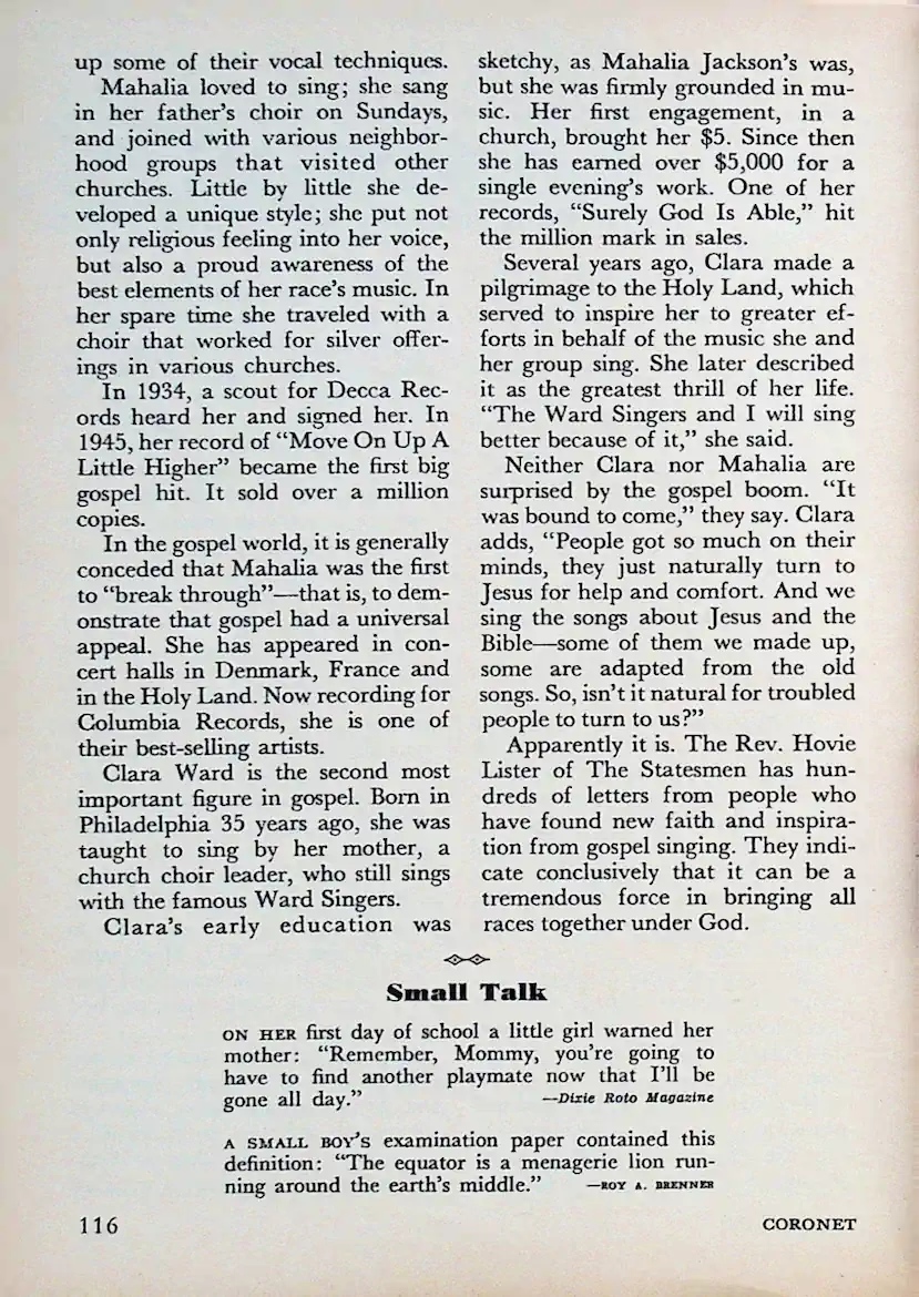 Das Erscheinen des Artikels fiel in eine Ära des Umbruchs. Mahalia Jackson hatte gerade das Publikum beim Newport Jazz Festival zu Tränen gerührt und im Film St. Louis Blues mitgewirkt. Für die vorwiegend weißen Leser von Coronet war sie die Brücke zu einer Kultur, die voller Kraft, Hoffnung und Würde steckte – Werte, die das Magazin über alles schätzte.