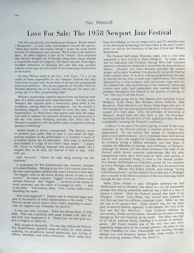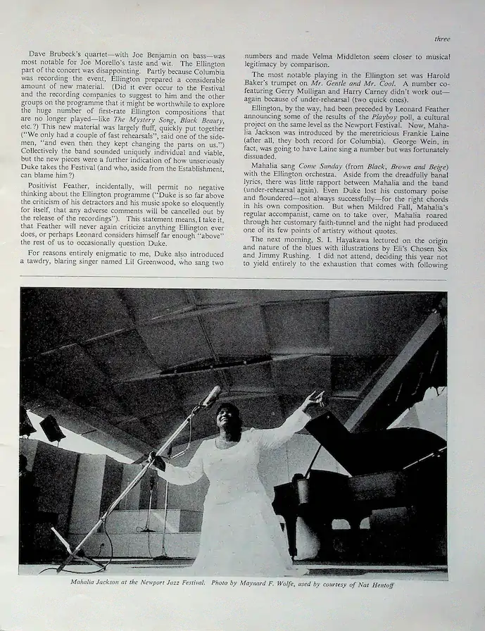 Er schrieb ausführlich über Mahalias bahnbrechenden Auftritt beim Newport Jazz Festival 1958. Dieser Text ist historisch besonders wichtig, da er analysiert, wie eine Gospel-Sängerin das traditionell eher weltliche Jazz-Publikum emotional „bekehrte“.