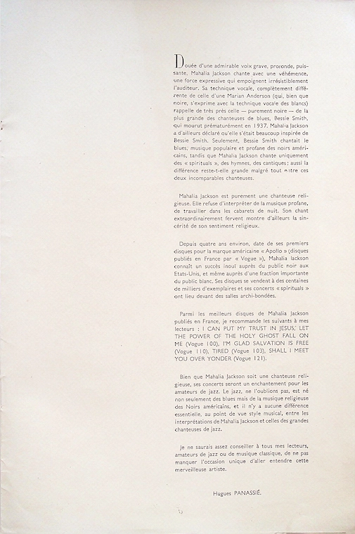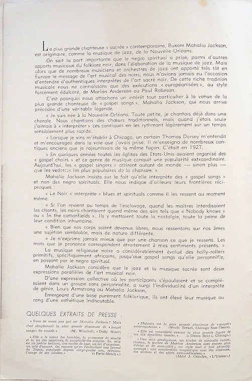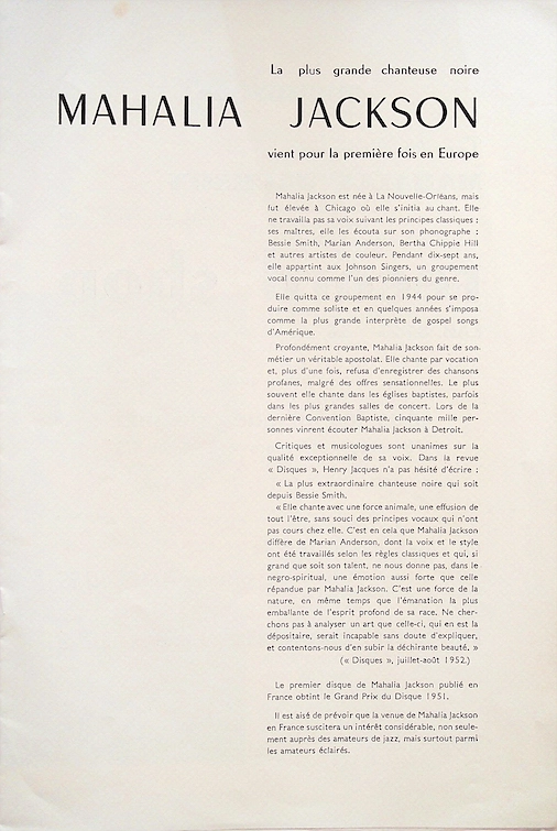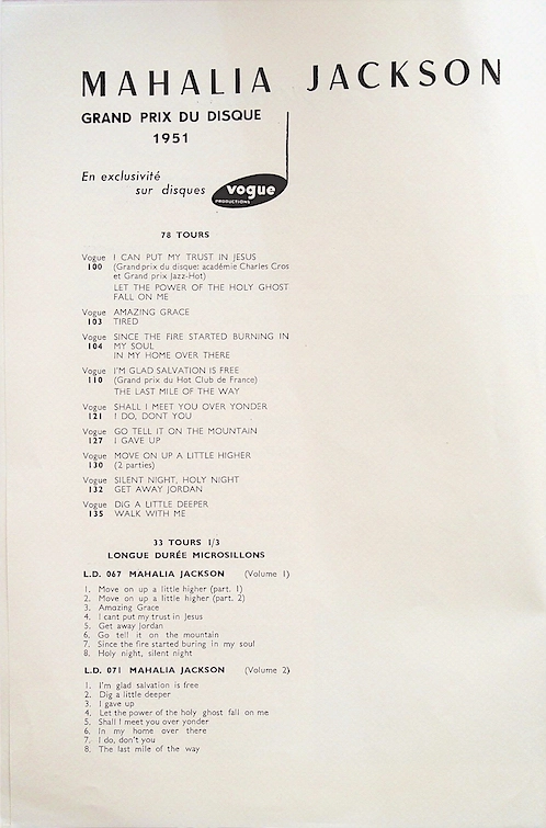 Der Grundstein für Mahalia Jacksons internationalen Ruhm wurde in Frankreich gelegt, noch bevor sie einen Fuß auf europäischen Boden setzte. Nach dem Erfolg ihrer Apollo-Aufnahmen und insbesondere "I Can Put My Trust in Jesus", wurde ihr 1951 in Paris ein prestigeträchtiger Preis der Académie Charles Cros verliehen, der oft als "französischer Oscar" bezeichnet wird.