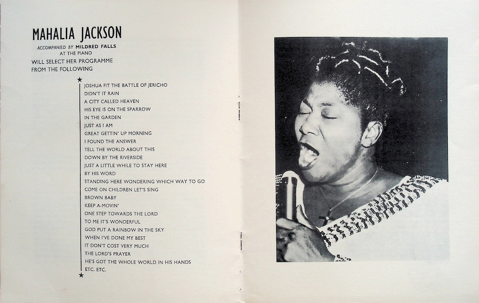 Mahalia Jackson wurde bei diesem denkwürdigen Konzert von Mildred Falls am Klavier begleitet. Im Gegensatz zum früheren Auftritt gab es diesmal keinen Organisten.