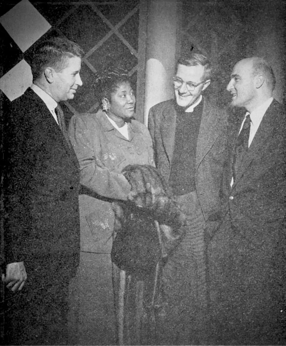 Turk Murphy (Posaunist), Mahalia Jackson, Rev. Alvin Kershaw (als Show Kandidat) und George Avakian. Aufgenommen 1955 während der $64.000 Question Show.